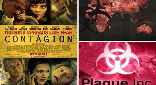 Dirigido por Steven Soderbergh, a produção tem no elenco Matt Damon, Gwyneth Paltrow, Laurence Fishburne e Marion Cotillard. Na história, um vírus fictício (MEV-1) surge de um morcego, passa para um porco e, por fim, chega aos humanos. Contágio mostra uma mulher que viajou e contraiu o vírus em Hong Kong. De volta ao seu país, ela morre e seu marido é obrigado a ficar em quarentena.
