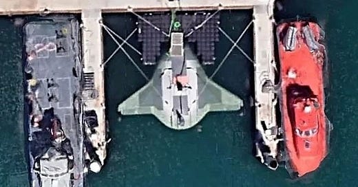 Acredita-se que o impressionante veículo, que parece saído de uma série de TV de Gerry Anderson (pense em Thunderbirds ou Stingray), seja um drone subaquático secreto conhecido como Manta Ray.